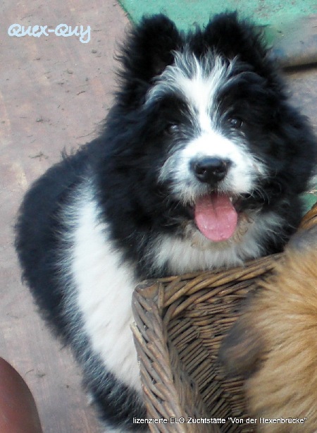 Queb hat gemäßigtes Rauhaar wie Mama Grenada, welches pflegeleicht bleibt. Wie wir Queb beschreiben: zu Menschen und Tieren freundlich, auch lieb zu Kindern. Mit seinen 5 Monaten ein von Statur kräftiger Bursche, tapsige große Pfötchen, so schön tolpatschig noch. Er liebt Spaziergänge, läuft im Geschirr gut mit und auch im Freilauf rufen wir ihn heran und er kommt wie ein kleiner Blitz angerannt. Dann gibt es auch zur Belohnung morgens sein "Frühstück" oder sonst getrockneten Silling, den mag er so sehr. Er ist schweigsam und wenn abends die Tiere des Waldes näher kommen, meldet er schon mit seiner Welpenstimme mit. Er fährt problemlos Auto mit.